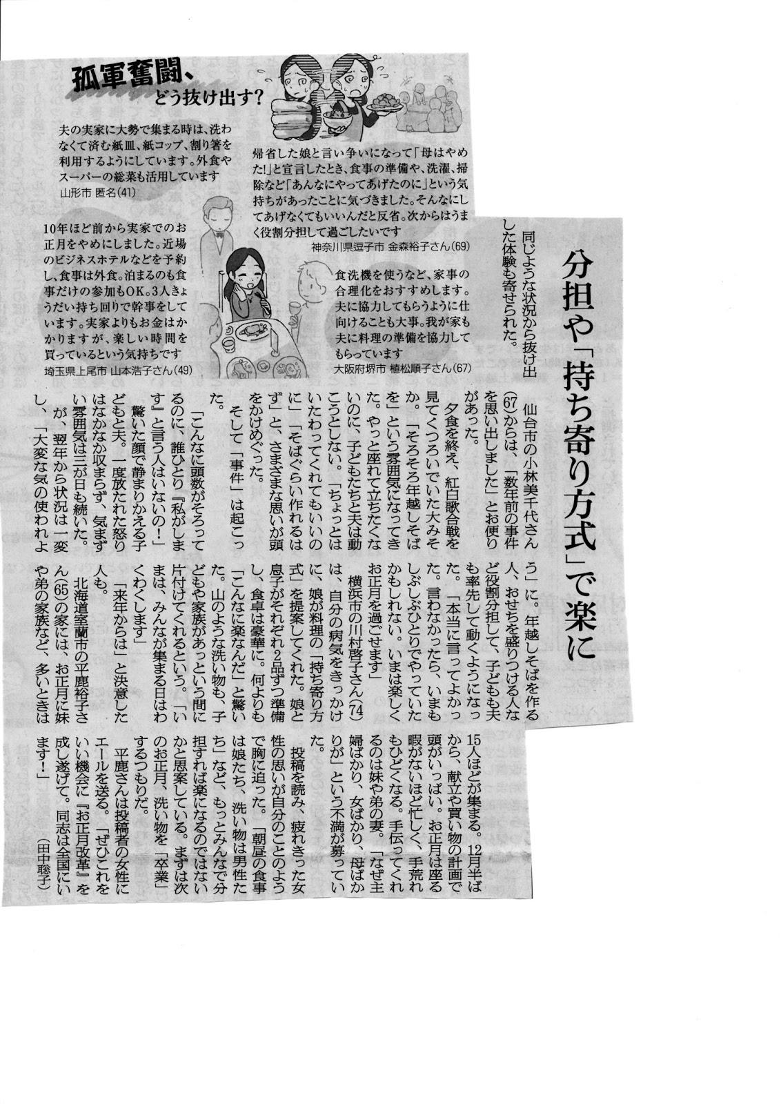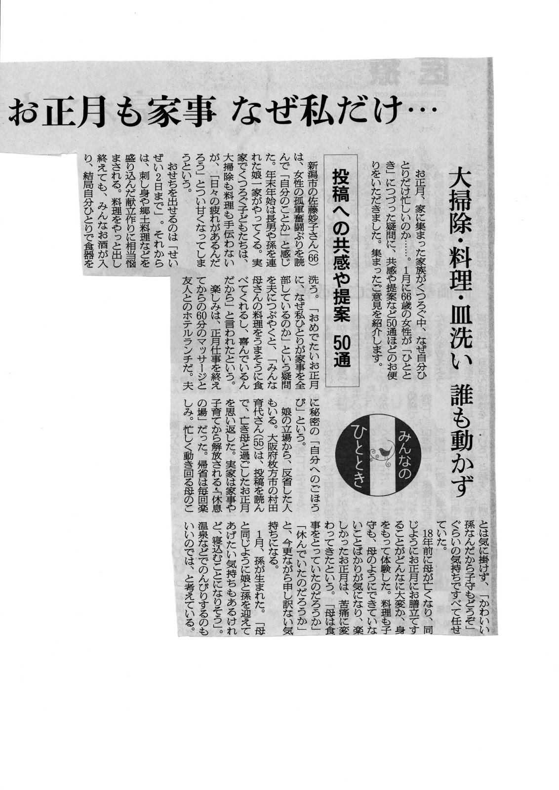 先月投書欄に載っていた「お正月、なぜ主婦だけが忙しい思いをするのか」に対して50通も反響があったようで スキャンしてここに掲載しておく